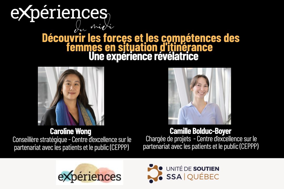Conférencières : Ce projet sera présenté par Caroline Wong, conseillère stratégique, et Camille Bolduc-Boyer, chargée de projet au Centre d'excellence sur le partenariat avec les patients et le public. Toutes deux ont été profondément marquées par ce projet et ont hâte de partager leurs réflexions avec la communauté.